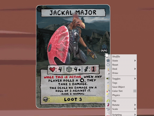 From this section onwards I will be explaining how state cards and flip cards work in the physical medium. In tabletop simulator, players can look at states by simply right clicking and changing states to look at the different card states.